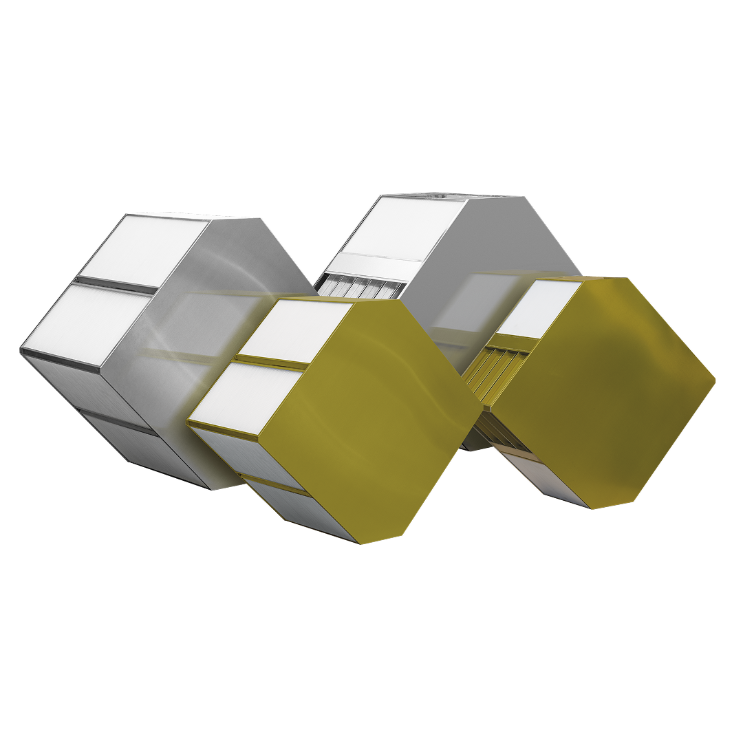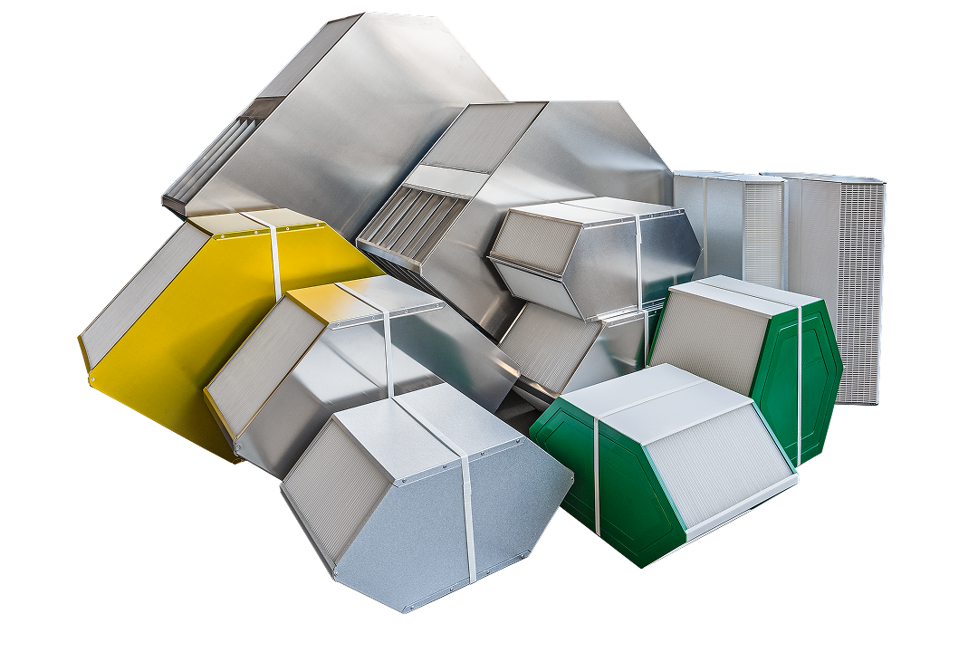 Twin-core modules joined by common plenums to handle higher airflows with a lower pressure drop while keeping all counter-flow benefits.