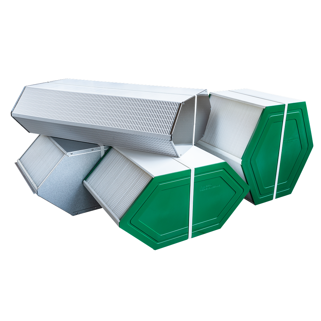 In counter-flow heat exchangers, two air streams flow in opposite directions through thin channels formed by a layered polystyrene or polymer membrane structure. This counter-flow configuration ensures a consistently high temperature gradient across the entire core length, enabling highly efficient heat transfer.