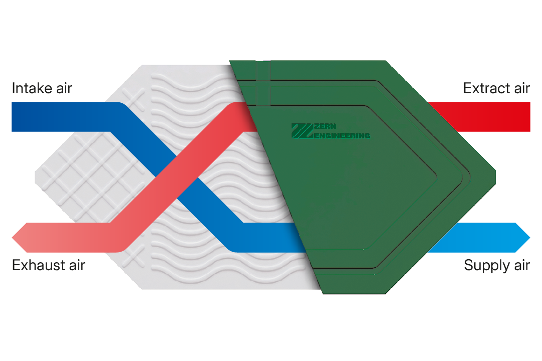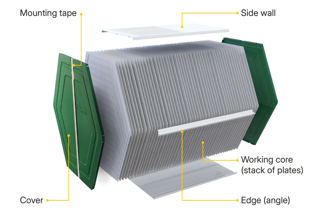 Polymer plates bonded with a microporous, vapor-permeable membrane recover both heat and moisture - ideal for cold or dry climates and RH control.