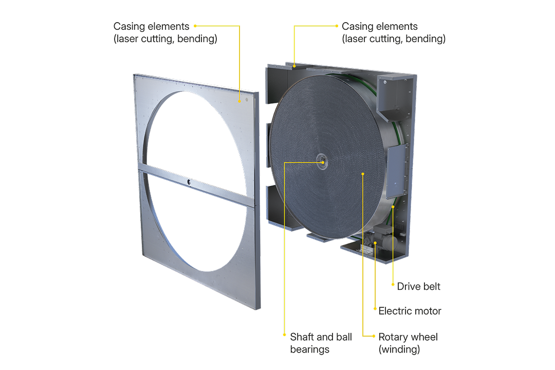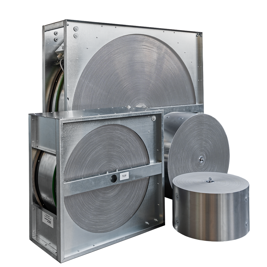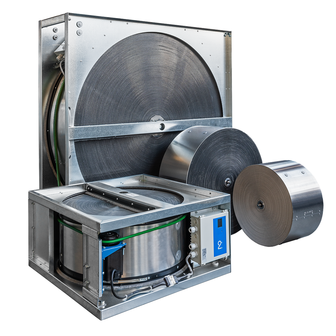 A rotary heat exchanger consists of a rotating wheel made up of numerous small air ducts or channels, typically constructed from aluminum. This wheel rotates between two separate air streams: the warm exhaust air and the cooler incoming fresh air. As the wheel turns, it absorbs heat from the outgoing air and transfers it to the incoming air, effectively recovering energy that would otherwise be lost. In units equipped with hygroscopic coatings, moisture can also be transferred, facilitating humidity control.