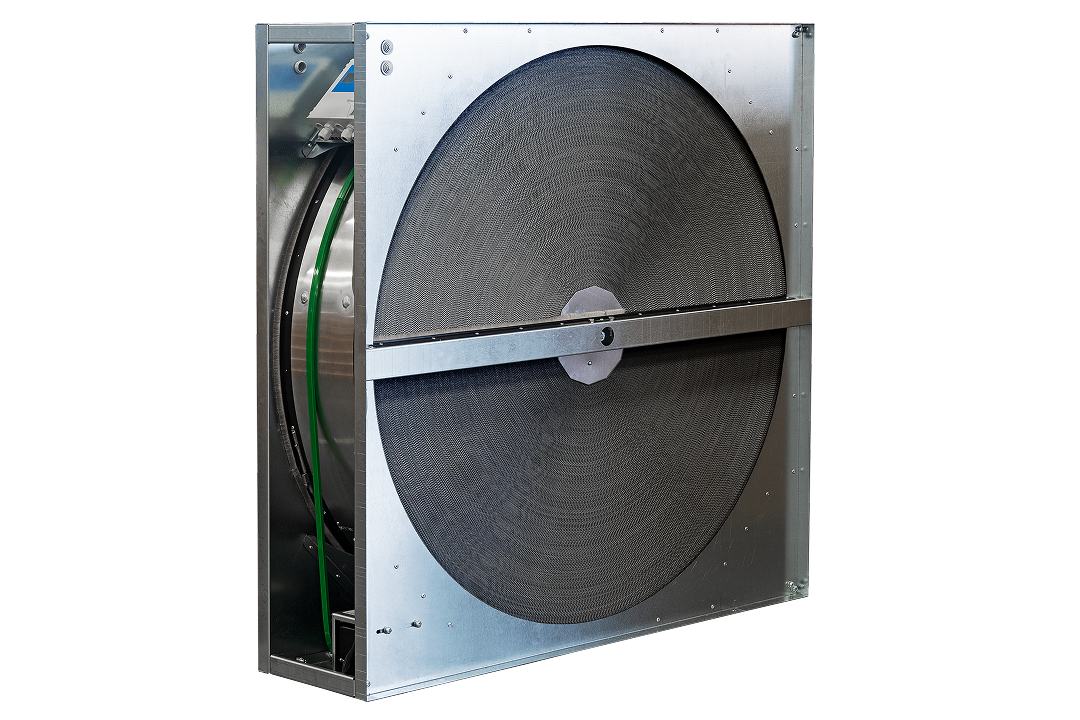 A perforated aluminum wheel rotates between the warmer exhaust air and the cooler supply air. As it turns, the matrix absorbs heat from the exhaust air and releases it back to the supply stream.