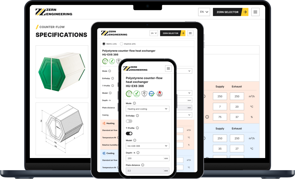 ZERN ENGINEERING - це компанія, що здійснює повний цикл виробництва широкого асортименту рекуператорів типу «повітря-повітря», включаючи протиточні та перехресні пластинчасті рекуператори, їхні ентальпійні моделі та роторні колеса.
